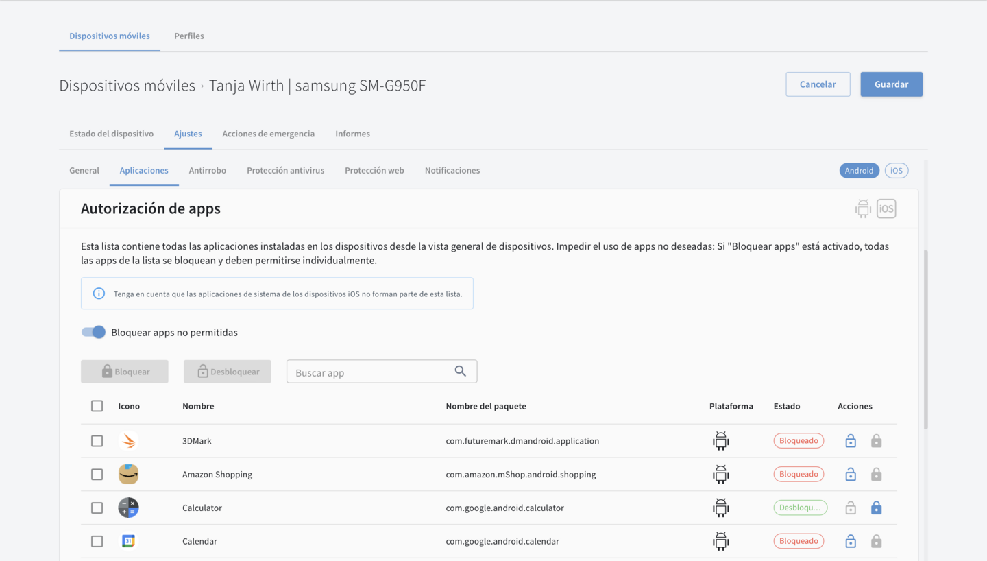 Controle la seguridad de sus dispositivos móviles en el panel central.